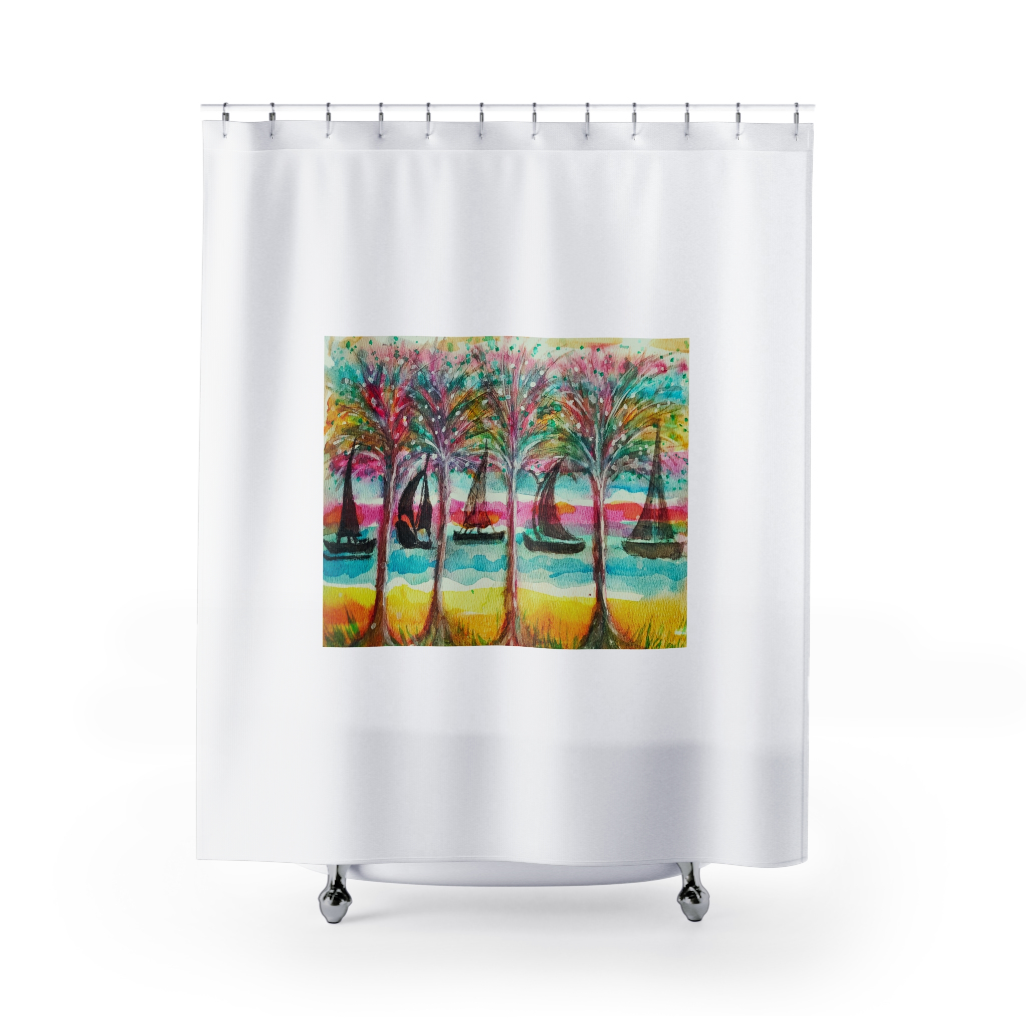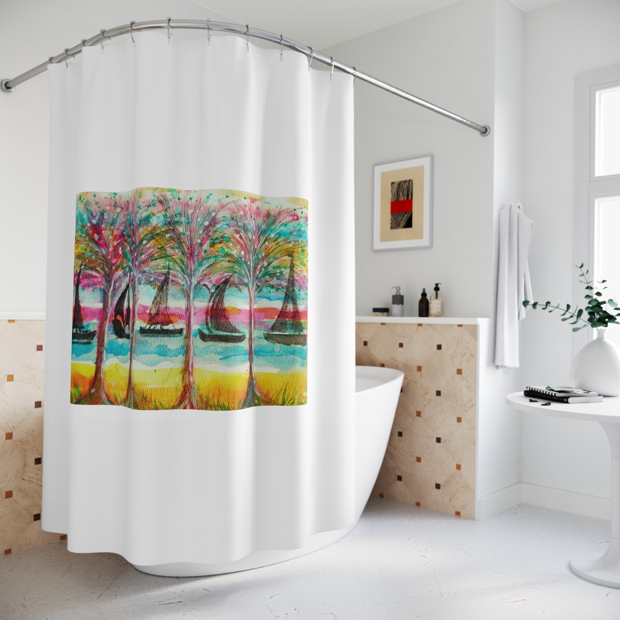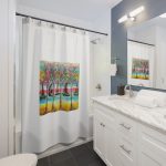 This shower curtain is here to add an original touch to any bathroom with your designs. Made with highly durable polyester, this curtain stays like new for a long time to come and is a perfect printing area for your art. Please note: While polyester offers adequate protection against water, a liner might be necessary for full waterproofness.