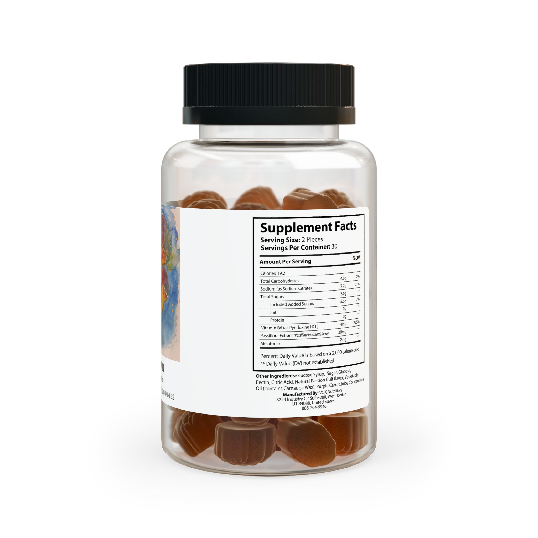 Ingredients: Sodium (as Sodium Citrate), Vitamin B6 (as Pyridoxine HCL), Passiora Extract (Passiore incarnata)(herb), Melatonin. Other Ingredients: Glucose Syrup, Sugar, Glucose, Pectin, Citric Acid, Natural Passion fruit avor, Vegetable Oil (contains Carnauba Wax), Purple Carrot Juice Concentrate
